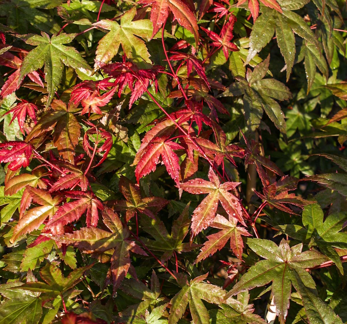 Acer palmatum is a small deciduous tree valued for its finely divided foliage and exceptional autumn colour. Native to Japan, Korea, and China, it brings a delicate, architectural quality to gardens and landscapes. The leaves, typically five- to seven-lobed, emerge in spring in shades of green, red, or bronze before transforming into vivid tones of crimson, orange, and gold in autumn. Preferring sheltered positions with moist, well-drained soil, it thrives in partial shade, where its colours are often most intense. Its compact form makes it ideal for smaller gardens, courtyards, or as a focal specimen in larger landscapes, where its seasonal display provides striking contrast against evergreens or structural planting.