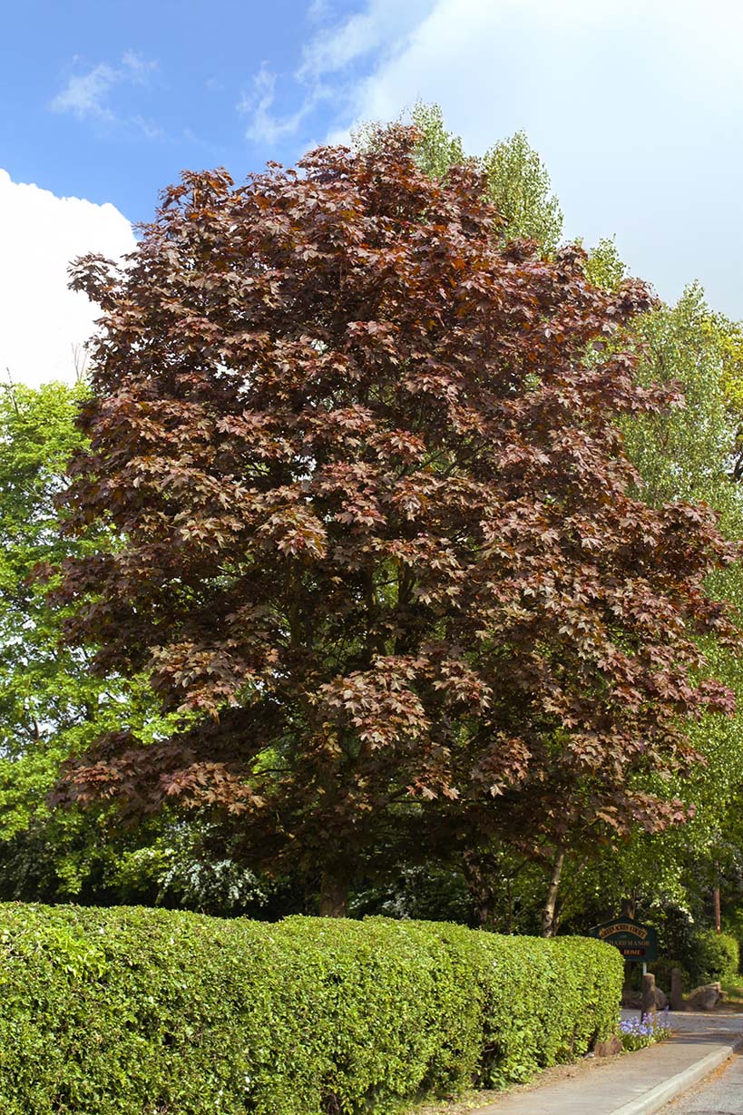 A vigorous and large maple widely planted in urban and parkland settings. Its deep crimson-purple foliage in autumn provides a striking contrast to surrounding greenery, creating visual impact in avenues, open spaces, and public landscapes. The tree’s lobed, glossy leaves retain their rich colour well into the season, ensuring that it stands out even as other trees begin to fade. ‘Crimson King’ is adaptable to a variety of soil types, tolerates pollution, and withstands exposure to wind, making it particularly suitable for city planting schemes. The tree’s strong, upright habit also allows it to function as both a specimen feature and part of structured landscape designs, while its long lifespan ensures ongoing seasonal interest for years to come.