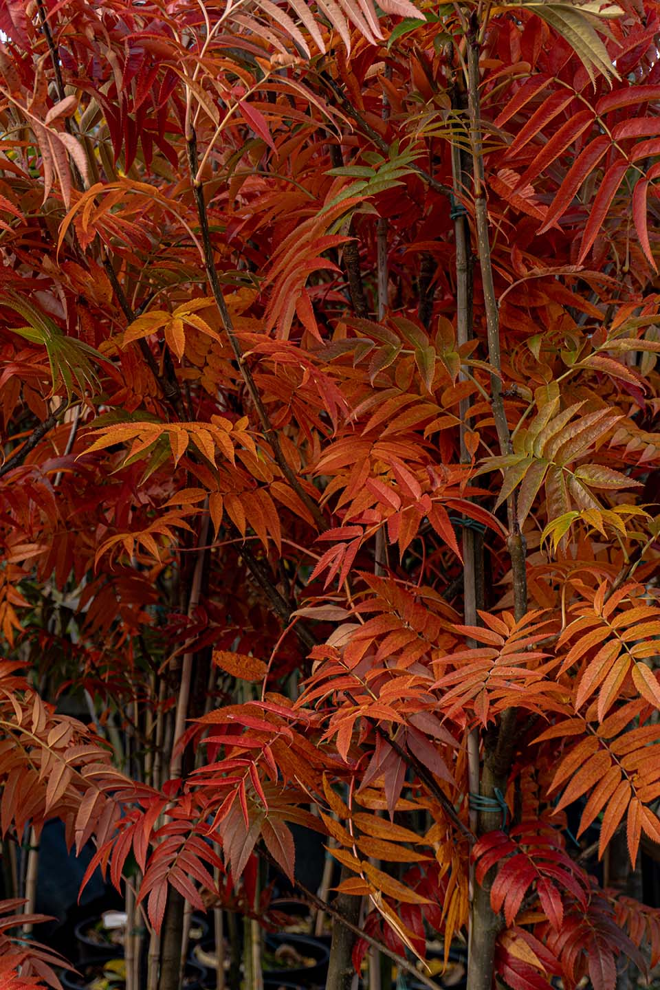 Commonly known as Japanese mountain ash, it has gained popularity in UK landscaping due to its compact size and fiery autumn foliage. The cultivar ‘Olympic Flame’ is particularly valued for its exceptional colour, with leaves turning shades of deep orange and bright red before dropping. Clusters of bright red berries follow the leaf colour, adding winter interest and attracting birds to the garden. Its relatively small stature makes it suitable for courtyards, urban planting, and smaller garden spaces where a dramatic, high-impact tree is desired without overwhelming the site. Beyond its visual appeal, this tree is hardy, tolerant of a range of soil types, and performs well in both sheltered and moderately exposed locations. Its combination of autumnal brilliance, berry display, and manageable size make it a reliable choice for both commercial and residential landscaping.
